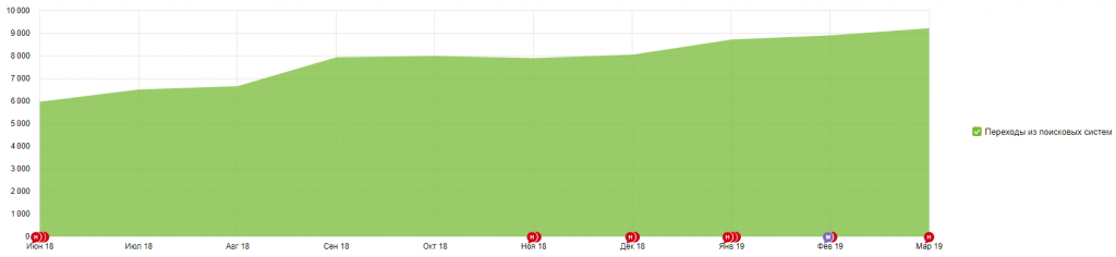 Увеличение количества переходов из поисковых систем (согласно данным Яндекс.Метрики) в 1,5 раза:
