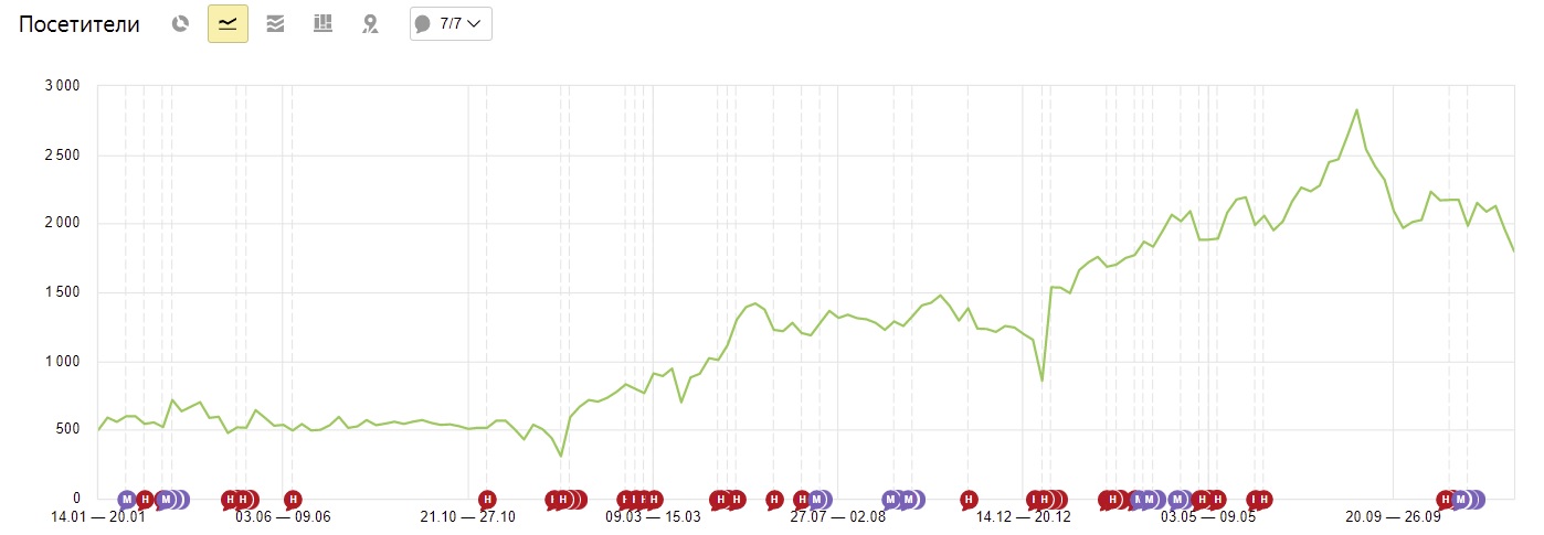 Дальнейшая работа по продвижению сайта сводилась к точечной корректировке мета-тегов наиболее важных разделов, мониторинге доступности для пользователей и наращиванию ссылочной массы (максимально естественным образом — доля SEO-ссылок менее 5%). Как результат данной работы, в 2019 году посещаемость сайта составляла в среднем 500-600 посетителей в неделю.