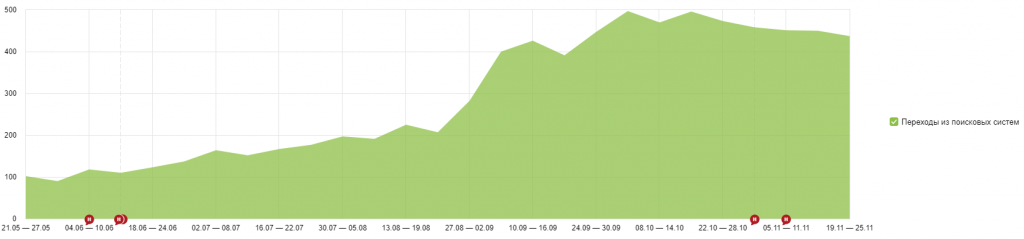 Результат данных работ появился не сразу — поисковые системы упорно не хотели признавать, что на коммерческом сайте может размещаться полезный информационный материал. Но со временем, после регулярного размещения статей на протяжении полугода, появился результат, причем весьма значительный: