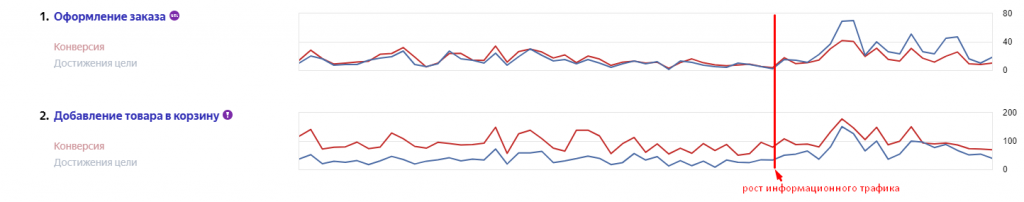 Большая часть пользователей, приходящих на сайт по статьям, конечно же приходит не за покупками, и, получив ответ на свой вопрос, тут же уходит с сайта. Но при помощи правильной перелинковки мы все же смогли заинтересовать часть посетителей и конвертировать их в покупателей (о чем говорят графики по достижению целей):