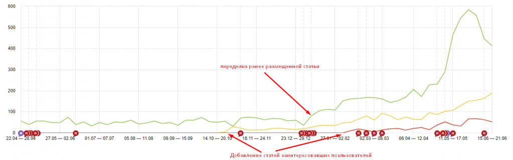 К сожалению, при правильной первичной оптимизации сайта довольно сложно в дальнейшем показать значительные результаты только за счет технических работ. В результате сайт вошел в режим стагнации, и все работы, которые проводились по сайту, позволяли ему уверенно держаться на своих позициях, но значительного роста не давали. Тогда было решено расширять контентную базу (писать уникальные и полезные для пользователей статьи по тематике строительства). В итоге, кроме работ по сайту, мы дополнительно размещали новый материал, который может быть интересен потенциальным покупателям.